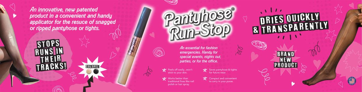 Pantyhose Run-Stop® is our new patent-pending innovation which is the first product to ever be commercially marketed to apply to snags and small tears in sheer hosiery, preventing the progressive unraveling of the knitted nylon mesh-- commonly referred to as "runs" of "ladders".